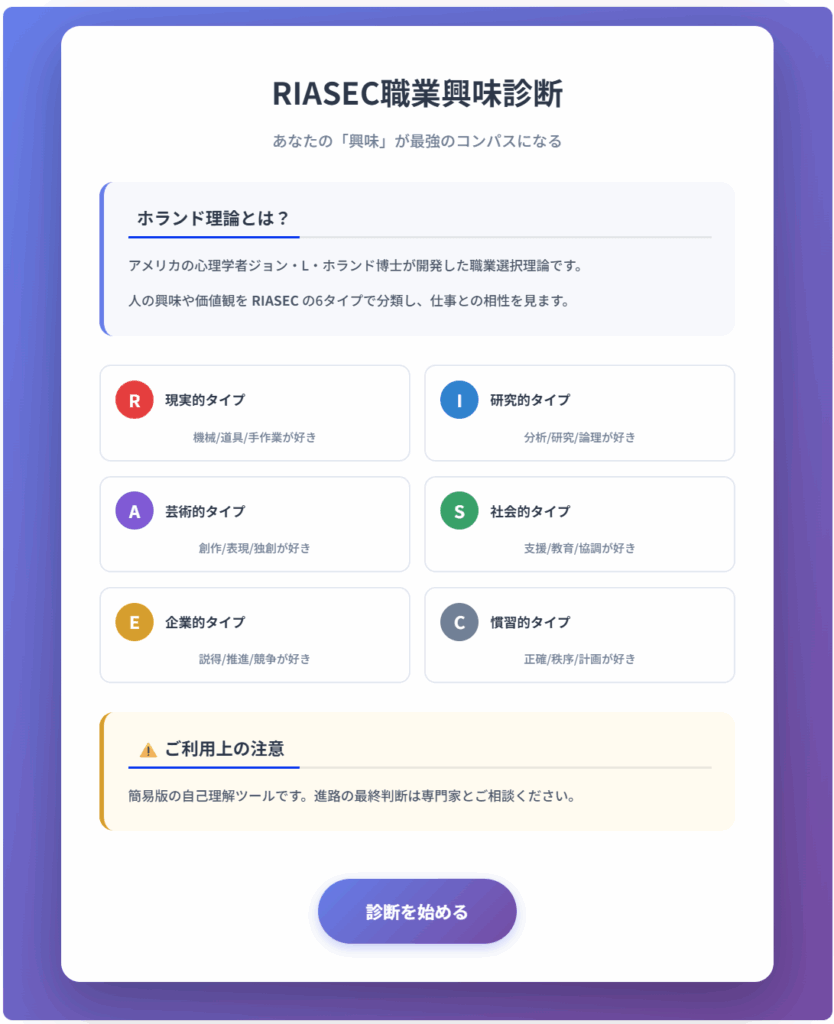 心理学者ホランドの「RIASEC理論」に基づき、24の質問に答えるだけで、あなたの興味の傾向を6つのタイプ(現実的・研究的・芸術的・社会的・企業的・慣習的)に分類します。