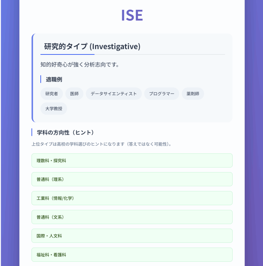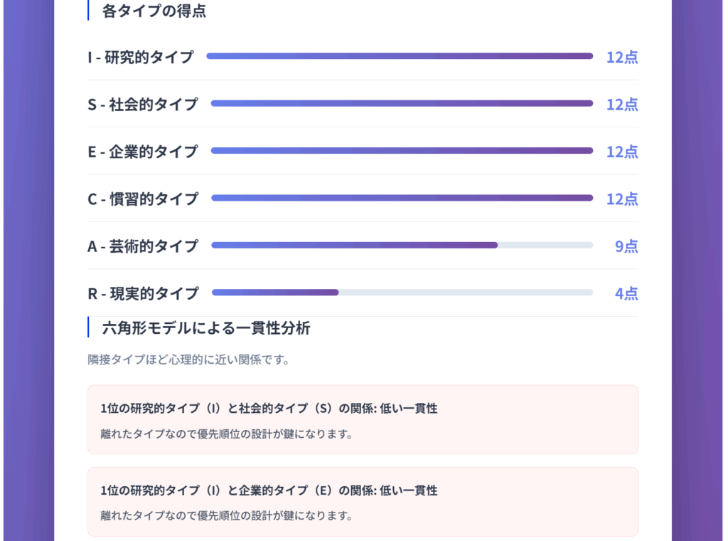 診断後は、上位3タイプから「あなたのホランド・コード」を算出し、適職例や向いている学科の方向性を表示。棒グラフや一貫性分析も自動で行い、視覚的にわかりやすくまとめています。