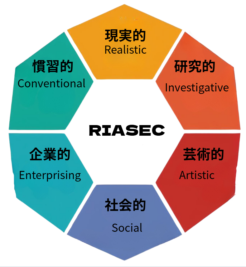 RIASEC(リアセック)とは、ホランド博士が見出した、人々の興味や価値観の6つの基本的なタイプを指す頭字語です 。