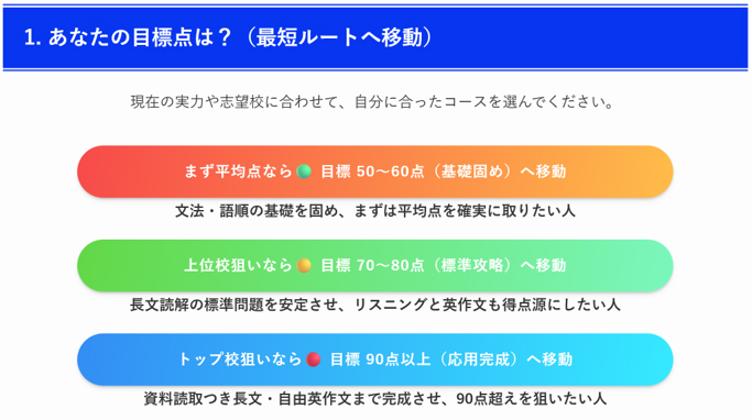 各ページには、「目標点別(50点・70点・90点)の学習ロードマップ」が用意されています。 今の自分の実力に合わせたルートを選び、指定された単元に取り組んでください。
